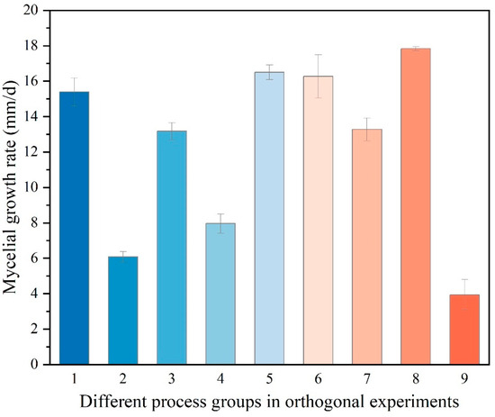 Mycelial growth rate of Dichomitus squalens in different process groups in orthogonal experiments. The ‘1’ treatment group in the image corresponds to ‘Text No. 1’ in Table 3, and so on.