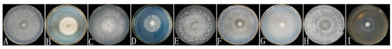 Mycelial growth vigor of different treatments of Dichomitus squalens in orthogonal experiments. (A) Processing 1, (B) processing 2, (C) processing 3, (D) processing 4, (E) processing 5, (F) processing 6, (G) processing 7, (H) processing 8, and (I) processing 9. “Processing 1” is equivalent to “Text No. 1” as presented in Table 3, and so on.