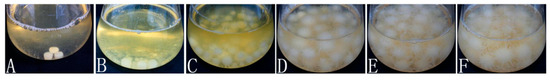 Liquid strain cultivation: By the sixth day following inoculation, spherical mycelial aggregates, measuring 4–8 mm in diameter, with radially extending hyphae, were observed to form in the liquid medium (Figure 7C). By the twelfth day, these structures developed into echinate mycelial masses, measuring 10–12 mm in diameter, and exhibited a pure white coloration. They were uniformly distributed within the clarified liquid medium, indicating the successful preparation of the liquid strain (Figure 7E).