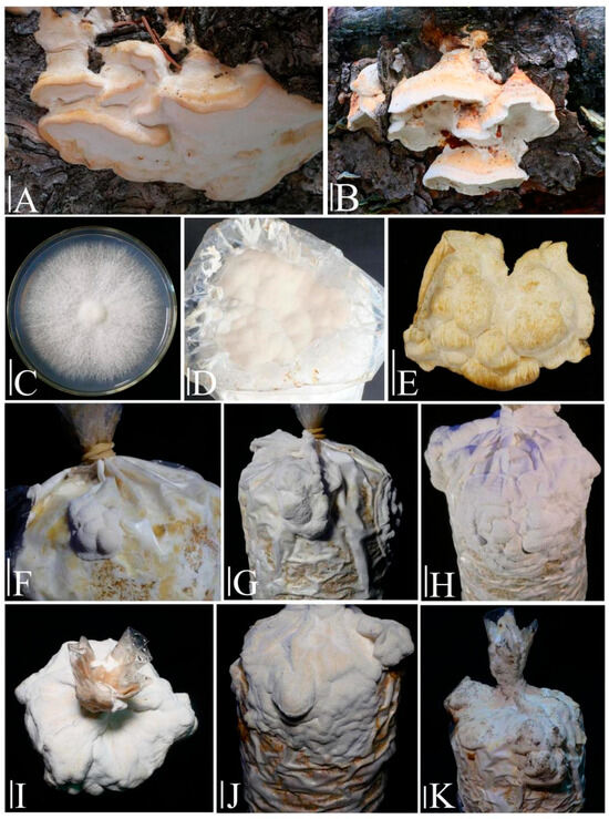 Dichomitus squalens. (A,B) Basidiocarps in situ. (C) Isolated mycelia. (D) Primoridia (E) Mature fruiting bodies grown. (F,G) Juvenile fruiting bodies. (H–J) Unmature fruiting bodies. (K) Mature fruiting bodies. Scale bars: 2 cm.