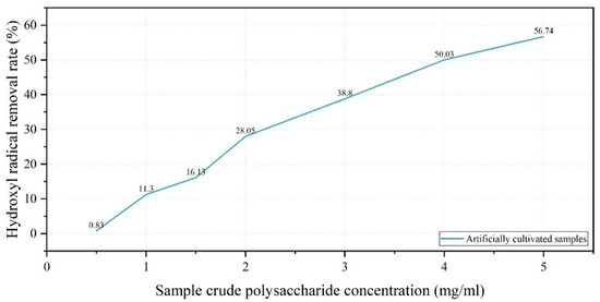 In this experiment, crude polysaccharide solutions (0.5–5.0 mg/mL) derived from cultivated Dichomitus squalens fruiting bodies demonstrated a concentration-dependent positive correlation with hydroxyl radical scavenging activity. The maximum scavenging rate of 56.74% was attained at a polysaccharide concentration of 5.0 mg/mL (Figure 9).