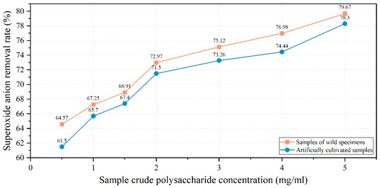 The experimental findings indicated that crude polysaccharide solutions (0.5–5.0 mg/mL) derived from both cultivated and wild fruiting bodies of Dichomitus squalens demonstrated concentration-dependent positive correlations with superoxide anion radical scavenging capacity. At the highest concentration tested (5.0 mg/mL), polysaccharides derived from cultivated fruiting bodies exhibited a scavenging rate of 78.3%. In contrast, under the same conditions, polysaccharides from wild fruiting bodies demonstrated a slightly higher scavenging efficiency of 79.67% (Figure 10).