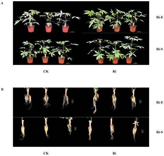 In this study, the morphological characteristics of cassava in mycorrhizal and non-mycorrhizal treatments were detected. Mycorrhizal cassava (Ri, inoculated with AMF: Rhizophagus irregularis) and non-mycorrhizal cassava (CK, not inoculated with AMF) potted plants were sampled at the early and stable stages of symbiosis after inoculation with AMF (Figure 1). The influence of AMF on the growth of cassava seedlings was analyzed by measuring indicators such as plant height, stem thickness, fresh weight of the aboveground part, and root weight of the underground part. During the early stages of symbiosis, mycorrhizal cassava exhibited a slightly superior plant height compared to non-mycorrhizal cassava. During the stable symbiosis phase, mycorrhizal cassava had a significantly higher plant height (10.55%) than non-mycorrhizal cassava (Table A1). The fresh weight of the aboveground parts of mycorrhizal cassava was also significantly higher than that of non-mycorrhizal cassava in both periods, increasing by 31.02% and 13.91% at the two time points (Table A1). This indicates that inoculation with AMF has a certain promoting effect on the growth and development of the aboveground part of cassava after the establishment of the symbiotic relationship. To observe the effect of AMF inoculation on the underground parts of cassava plants, the plants were removed entirely from the pots in the early and stable stages of symbiosis after inoculation with AMF. Impurities on the root surface were gently washed with clean water, and the roots were dried with absorbent paper. Photos were taken to observe the phenotype (Figure 1B). We cut off the root completely and placed it under a balance to weigh the fresh weight of the underground root. Table A1 shows that the fresh weight of mycorrhizal cassava roots increased significantly by 23.59% in the early stage of symbiosis compared with the control group, and increased extremely significantly by 29.61% in the stable stage of symbiosis. This indicates that AMF can significantly affect the growth and development of the underground roots of cassava after symbiosis, especially in the early stage of symbiosis, and this effect increases over time.