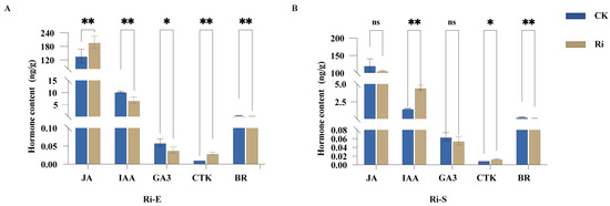Effects of AMF on endogenous hormone levels in cassava root systems. (A). Endogenous hormone levels in cassava root systems during the early symbiotic stage and (B). Endogenous hormone levels in cassava root systems during the stable symbiosis stage. Quantitative comparison of jasmonic acid (JA), indoleacetic acid (IAA), gibberellin (GA3), cytokinin (CTK), and brassinolide (BR) in cassava plants inoculated with AMF at early and stable symbiotic stage. Bars represent mean ± standard error (n = 3 biological replicates). Asterisks indicate statistically significant differences between treatments (* p < 0.05, ** p < 0.01; ns: no significant difference. Student’s t-test).
