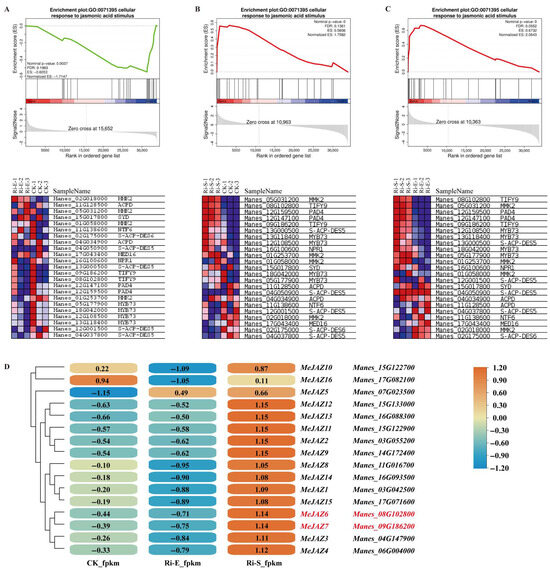 GSEA analysis and gene expression association analysis of GO gene set. (A–C) are GSEA (gene set enrichment analysis) results of GO:00071395 gene set, showing the enrichment score change trend of gene set in samples through broken line graph, and the expression pattern of corresponding genes in the lower heat map; (D) is the cluster heat map of expression quantity of MeJAZ family genes in different samples (CK, Ri-E, and Ri-S), indicating the change amplitude of gene expression quantity with color gradient, visually showing the expression correlation and pattern difference of genes under different conditions.