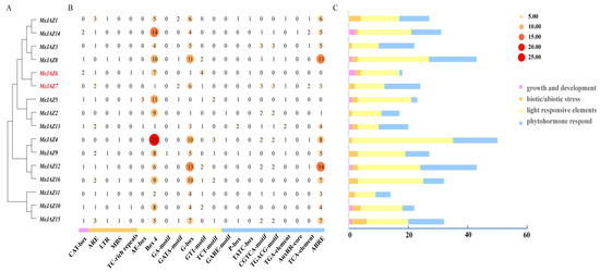 Analysis of cis-acting response elements in the promoter region of MeJAZ genes. (A): MeJAZ gene family evolutionary tree. (B): Heat map of the number of cis-acting elements in the promoter region of the MeJAZ genes. (C): Statistical bar chart of the four types of response elements of the MeJAZ gene promoter.