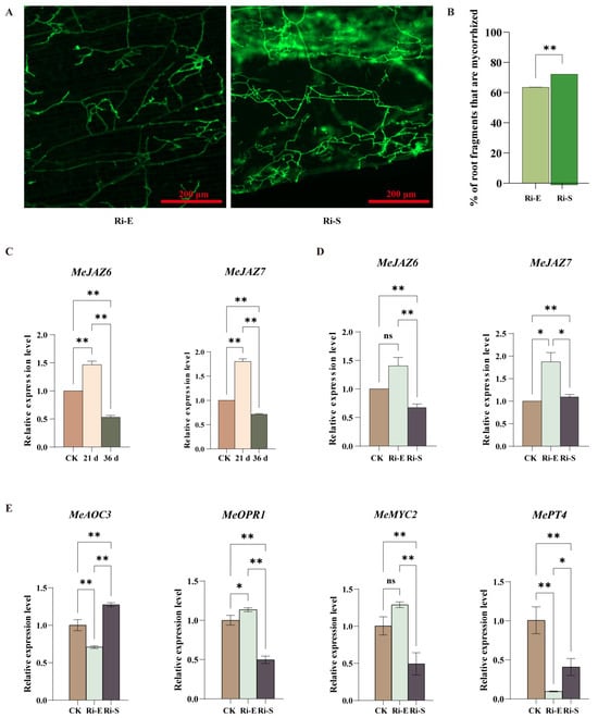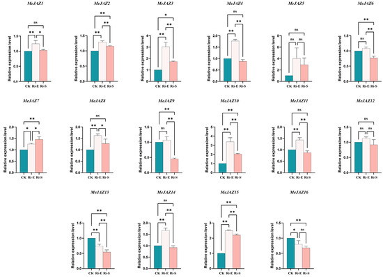 Expression analysis of MeJAZ family genes in different treatment groups. Each panel shows the relative expression of different MeJAZ genes in the control group (CK), Ri-E group, and Ri-S group, respectively. Ri-E: Early symbiotic stage. Ri-S: Stable symbiotic stage. Different color bars in the histogram represent corresponding groups, and the expression differences of each gene under different treatment conditions are presented through inter-group comparison. Bars represent mean ± standard error (n = 3 biological replicates). Asterisks indicate statistically significant differences between treatments (* p < 0.05, ** p < 0.01; ns: no significant difference. Two-way ANOVA).