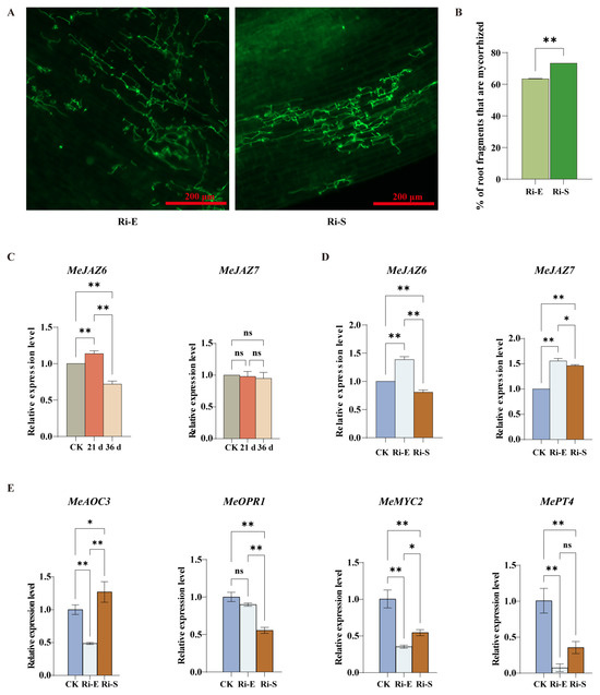 Effect of high concentration of jasmonic acid on symbiotic interaction between cassava and AM. (A). Microscopic observation of AMF symbiosis after treatment with high-concentration jasmonic acid. The green organelles indicate proliferating fungal hyphae. Pictures were taken at 20×, and scale bars indicate 200 µm. (B). Quantitative comparison of cassava planting rate. (C). Analysis of the expression pattern of the MeJAZ gene family in normal cassava treated with high concentration. (D). Analysis of the expression pattern of the MeJAZ gene family in mycorrhizal cassava treated with high concentration. (E). Expression levels of MePT4, MeAOC3, MeOPR1, and MeMYC2 genes during the initial and maintenance stages of AM symbiosis. Bars represent mean ± standard error (n = 3 biological replicates). Asterisks indicate statistically significant differences between treatments (* p < 0.05, ** p < 0.01; ns: no significant difference. (B): Student’s t-test; (C–E): Two-way ANOVA).