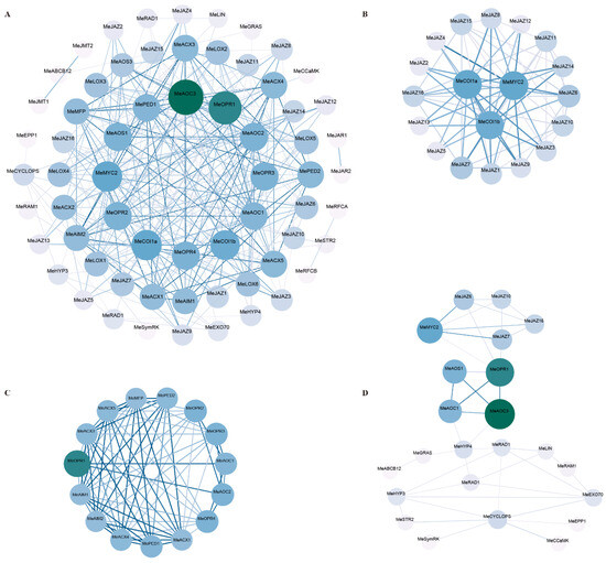 PPI predicts the interaction between JA biosynthesis, JA signal response protein, and AM symbiotic signal key factors. The overall protein interaction prediction results. (B–D) are subnetworks of (A). (B) The subnetworks with the highest scores filtered by the Cytoscape 3.10.3 MCODE plug-in (parameters set to default values). (C) The predicted interaction among MeCOI1, MeJAZ, and MeMYC2, key proteins of JA signaling pathway. (D) The prediction of interactions between candidate MeJAZ proteins, JA biosynthesis key proteins, and symbiotic signaling pathway key proteins. Darker and larger nodes represent a higher number of protein interactions, while darker edges indicate stronger interactions between nodes.
