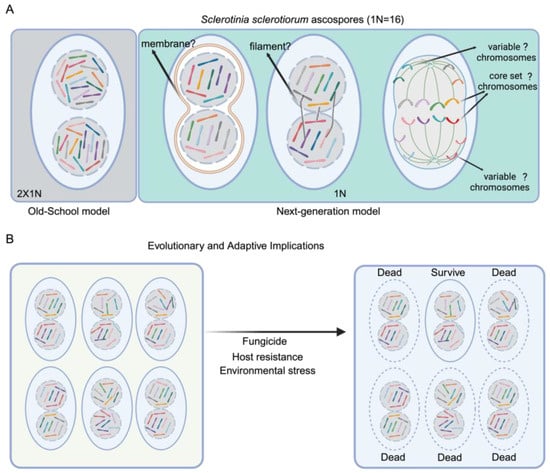 On the other hand, this new chromosome assortment system generates a dynamic pool of genetic variability within single cells. By partitioning a limited and variable subset of chromosomes into individual nuclei, these fungi might reduce the genetic load associated with deleterious mutations, thus lowering the fitness costs typically linked to genome instability. Additionally, this reduction may allow for a broader exploration of the genetic landscape, facilitating the emergence of advantageous gene combinations. This mechanism can potentially accelerate the accumulation and dissemination of virulence factors, antibiotic resistance genes, or stress-response elements, culminating in rapid phenotypic shifts that enhance pathogenicity and survivability (Figure 1B). To investigate this possibility, virulence assays comparing wild-type strains to artificially stabilized variants could reveal whether chromosomal variability enhances pathogenicity, while comparative genomics of field isolates might correlate specific chromosome distributions with host adaptation. Parallel systems in other organisms, such as cancer cells exhibiting chromosomal instability [7] or bacteria with dynamic plasmid exchange, further support the idea that genome flexibility enhances adaptive capacity [8,9]. In fungi, the ability to generate diverse genotypic combinations in situ, even alongside periodic sexual reproduction, presents a potent strategy for rapid evolution [10]. S. sclerotiorum relies on annual sexual cycles for propagation, and B. cinerea frequently undergoes sexual reproduction in nature; vegetative genotypic variability may contribute to short-term adaptation and population diversity. This mechanism could operate in parallel with sexual cycles, particularly in environments where rapid responses to selective pressures are advantageous. Therefore, the chromosomal segregation system is not merely a cellular curiosity but a fundamental evolutionary tool that fuels the continuous diversification and adaptability of these pathogens, enabling them to thrive amid the shifting challenges of their environments.