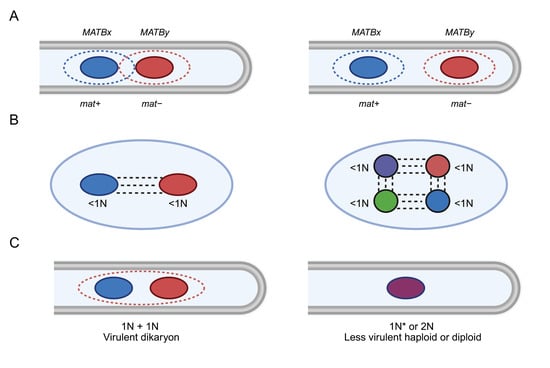 Models for internuclear recognition and potential contributions of mating type. (A) A depiction of the model involving pheromone and pheromone receptors establishing zones of influence/identity around nuclei, as proposed by [11,16]. The filamentous cell on the left depicts the situation where mating type loci (e.g., mat+ and mat− in P. anserina or MATB alleles of different specificity x and y in S. commune) create zones that facilitate recognition when nuclei are in close proximity. The cell on right depicts the lack of recognition when nuclei are far apart. (B) A model in which connections (e.g., membranes, proteins, cytoskeleton) enable recognition among nuclei for ascospores of S. sclerotiorum on the left and conidia of B. cinerea on the right. (C) An illustration of the difference in virulence for the dikaryotic cell type relative to the diploid cell type or a haploid strain carrying both specificities of the mating type loci (1N*) of U. maydis.