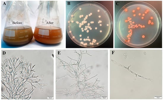 Phenotypic and functional characterization of T. pinophilus Y117: (A) Hydrolysis of corncob powder by Y117—(Left) untreated substrate; (Right) substrate after enzymatic degradation, showing visible structural breakdown. (B,C) Colony morphology of Y117 grown on (B) PDA (potato dextrose agar) and (C) YPD (Yeast Extract–Peptone–Dextrose) media after 5 days at 30 °C. (D–F) Hyphal morphology during enzyme production—(D) pre-production phase, (E) mid-production phase, and (F) late-production phase. Scale bars: 20 μm (D,E); 10 μm (F).