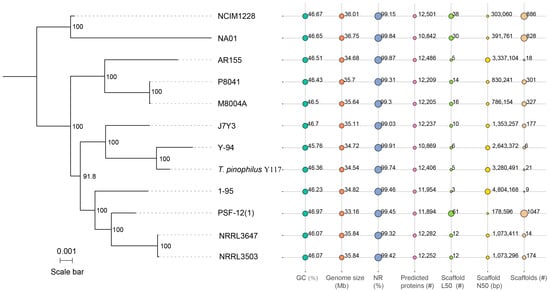 Phylogeny and genome statistics of Y117 and eleven other T. pinophilus strains. The phylogenetic tree was constructed using FastTree and MAFFT based on 5783 single-copy core genes (single-copy orthologs present in all strains). Seven bubble plots in the right panel illustrate key genomic features and sequencing quality parameters: GC content (%), genome size (Mbp), NR% (percentage of predicted proteins with BLASTP matches to NCBI Non-Redundant Protein Database), predicted protein count, scaffold L50 (number of scaffolds covering 50% of the genome), scaffold N50 (shortest scaffold length covering 50% of the genome), and total scaffolds. Bubble sizes are scaled within each panel and are not comparable across panels.