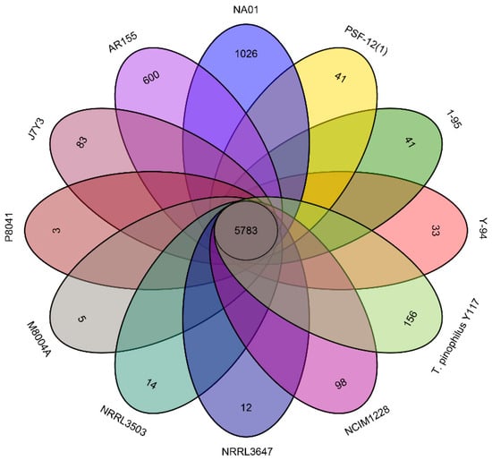 Strain-specific genes were identified among the predicted genes in the genomes of the twelve T. pinophilus strains. These genes were defined as meeting either of the following criteria: (1) <50% sequence similarity, or (2) <50% coverage when aligned with nucleotide sequences of genes from the other sequenced strains (whichever criterion was more stringent). Based on these criteria, more than 5783 genes were identified as homologous (Figure 4). The genome of T. pinophilus NA01 had the highest number of strain-specific genes (1026, Figure 4), followed by T. pinophilus AR155 (600) and T. pinophilus Y117 (156). An enrichment analysis was conducted to compare the strain-specific genes of an isolate with all the predicted genes of the same isolate. The analysis revealed that T. pinophilus NA01 exhibits significant enrichment in the GO terms related to fungal polarized growth and cellular morphogenesis, including “cellular bud” (GO:0005933), “site of polarized growth” (GO:0030427), and “cellular bud neck” (GO:0005935) (Figure S3). The GO enrichment analysis of strain-specific genes in strain AR155 revealed significant enrichment in biological processes related to cellular morphogenesis and genome maintenance (Figure S4). The most significantly enriched terms included ‘regulation of cell shape’ (GO:0008360), ‘regulation of cell morphogenesis’ (GO:0008632), ‘regulation of developmental process’ (GO:0050793), and ‘DNA metabolic process’ (GO:0006259). The genome of T. pinophilus Y117 is only represented in the GO term “organonitrogen compound biosynthetic process” (GO:1901566), which suggests distinct adaptations in nitrogen metabolism compared to other related strains.