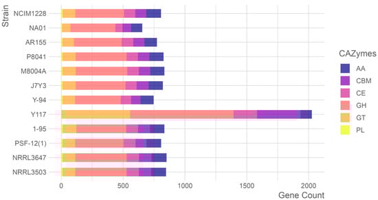 Comprehensive analysis of carbohydrate-active enzymes (CAZymes) across T. pinophilus strains revealed 2026 CAZyme-encoding genes within the 12,406 predicted proteins of T. pinophilus Y117. These genes spanned six functional classes, including 75 glycoside hydrolase (GH) families, 49 glycosyltransferase (GT) families, 14 carbohydrate esterase (CE) families, 34 carbohydrate-binding module (CBM) families, 9 auxiliary activity (AA) families, and 2 polysaccharide lyase (PL) families. Comparative genomic analysis with eleven additional T. pinophilus strains identified significant strain-specific variations in CAZyme gene content, highlighting the enzymatic diversity within this species (Figure 5). Notably, Y117 exhibited a substantial expansion of GH genes (n = 837), exceeding the other strains (363–416 genes) by 101–130%. Similarly, its CBM gene repertoire (n = 351) was 3.5–4.6 times larger than that of comparator strains (77–101 genes). These genomic features suggest elevated capacity for both glycosidic bond hydrolysis and carbohydrate substrate recognition in Y117. Conversely, Y117 showed reduced gene complements in AA (9 families) and PL (2 families) categories compared to the other strains, potentially reflecting specialized adaptations in oxidative and lytic enzymatic pathways. The exceptional enrichment of GH and CBM genes in Y117 correlates with its demonstrated efficiency in plant biomass degradation, while the relative paucity of AA and PL genes may indicate niche-specific metabolic specialization.