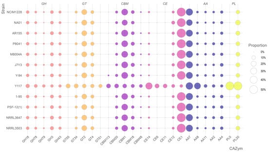 Bubble plot depicting the CAZyme profiles of the twelve T. pinophilus strains. For each CAZyme category, the five most prevalent clusters identified in strain Y117 were compared across all strains, if applicable. The size of each bubble indicates the proportion of genes in the cluster among all the genes belonging to the specific CAZyme category, and the colors indicate different CAZyme categories.