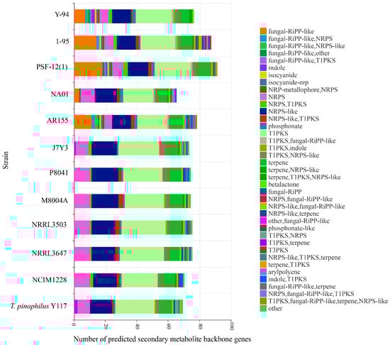 Comprehensive analysis of SM biosynthetic gene clusters (BGCs) was performed using fungal antiSMASH v6.0.1, revealing distinct strain-specific metabolic profiles (Table S2). T. pinophilus Y117 exhibited a streamlined SM repertoire, encoding only 69 backbone genes—the second lowest among all the strains after NA01 (Figure 7). This represents a 38.9% reduction compared to the most gene-rich strain, NRRL3503 (113 backbone genes), suggesting evolutionary selection for metabolic economy in Y117. The conserved core SM pathways present in all the strains included Type I polyketide synthases (T1PKSs) (19–28 clusters per strain), non-ribosomal peptide synthetases (NRPSs) (6–10 clusters), NRPS-like enzymes (12–17 clusters), and ubiquitous betalactone clusters (1 per genome). These evolutionarily maintained pathways likely support essential functions. Fungal-RiPP-like clusters displayed higher diversity in strain Y-94 and 1-95 (Y-94:7; 1-95:14), while these were completely absent in Y117, J7Y3, P8041, M8004A, and NRRL strains. While most strains possessed NRPS-T1PKS hybrids (0–3 clusters), Y117 uniquely lacked these but contained two indole and two T1PKS-NRPS clusters, reflecting divergent metabolic specialization. The complete absence of fungal-RiPP-like clusters in Y117, coupled with its simplified NRPS/T1PKS profile, could indicate adaptive genome streamlining favoring hydrolytic enzyme production over secondary metabolic complexity.