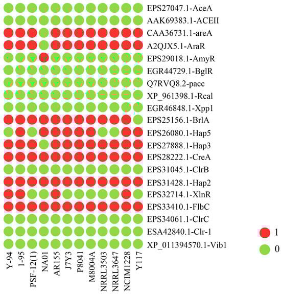 Transcription factors (TFs) play a crucial role in regulating gene expression and cellular processes, significantly influencing metabolite levels. To explore their potential regulatory contributions to strain-specific diversity in cellulose degradation, we compared the presence or absence of specific transcription factor (TF) genes among the twelve T. pinophilus strains (Figure 8). Several TF genes, such as CAA36731.1-areA, A2QJX5.1-AraR, EPS27888.1-Hap3, EPS28222.1-CreA, and EPS33410.1-FlbC, were identified in all strains, including Y117, indicating their conserved roles in fungal biology. Although Y117 shares most TF genes with other strains, with no TF genes uniquely present in this strain, several differences between Y117 and other strains have been observed. For example, EPS32714.1-XlnR is absent in Y117 but present in some other strains (e.g., Y-94, 1-95, AR155, and NCIM1228), indicating a possible difference in the regulation of xylanase-related pathways. The TF gene EPS25156.1-BrlA, which plays a key role in the initiation of asexual development in fungi, is present in all the strains except Y117, suggesting a potential loss or divergence in this regulatory pathway in Y117.
