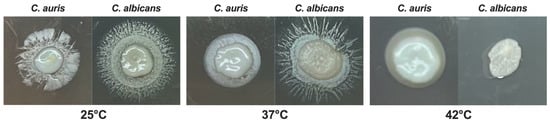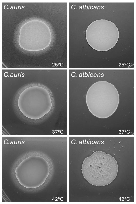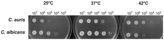 Previous studies reported that the optimal range of temperatures for C. auris is between 37 °C and 40 °C, similarly to C. albicans [2]. However, some C. auris isolates have been shown to grow at temperatures as high as 42 °C, a condition that inhibits the growth of C. albicans [39]. In the present study, we evaluated the impact of different temperatures on the growth of C. auris reference strain CDC B11903 and we compared it to the growth of C. albicans B90028 under the same experimental conditions. The temperatures were selected to mimic real conditions, i.e., temperatures easy to find in nature (25 °C) and anthropic environments, including normal human body temperature (37 °C), and the temperature occurring in patients with severe febrile status (42 °C) in response to an infectious disease. By spotting C. auris on SDA + CAF at different concentrations, we could not detect any visible difference in fungal growth for the concentration of 1 × 107 CFU/mL, irrespective of the growing temperature. However, by reducing the fungal inoculum we observed a growth impairment at 25 °C (and to a lesser extent at 42 °C), as compared to the optimal growing temperature of 37 °C. Notably, C. auris growth was impaired at 25 °C starting from the concentration of 1 × 105 CFU/mL while C. auris growth seemed to be almost unchanged at 42 °C even at low inoculum (i.e., down to 1 × 103 CFU/mL). Conversely, as expected, C. albicans showed to be most hindered in growing at 42 °C (Figure 1).