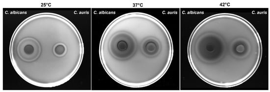 Concerning the lipase activity, our results show that, after 48 h of culture, both C. auris and C. albicans exert high lipase activity at 25 °C. The lipase activity was maintained at 37 °C both for C. auris (moderate activity) and C. albicans (high activity). Conversely, while C. auris showed lipase production also at 42 °C (moderate activity), C. albicans failed to produce lipase at 42 °C (Figure 5 and Table 4).