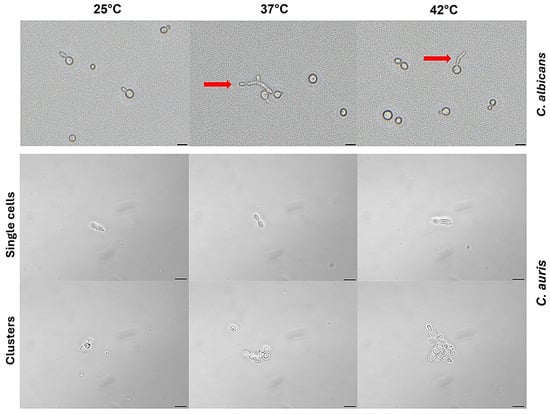 The morphological transition of C. albicans from yeast to filamentous form is influenced by several laboratory conditions, including temperature of 37 °C and the presence of serum, both mimicking the host tissue environment occurring in mammals [41]. Here, we evaluated the ability of C. auris strain CDC B11903 to germinate in the presence of 100% FCS under the temperatures of 25 °C, 37 °C and 42 °C. The germination was assessed by evaluating both single cells and clusters. As shown in Figure 6, C. auris failed to produce germ tubes under the above-mentioned conditions, in contrast to C. albicans, used as an internal control, which exhibited a positive germ tube test at 37 °C and 42 °C (Figure 6), with subsequent development into true hyphae and pseudohyphae.