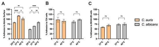 We next examined how temperature variation impacts on C. auris adhesion to different substrates: abiotic surfaces and epithelial cells such as the human bronchial epithelial cell line BEAS-2B and the T24 urothelial cell lines. Our results show that C. auris exhibited an increased capacity to adhere to abiotic surfaces at all the temperature tested, compared to C. albicans. Notably, its adhesion capacity increased with rising temperature, from 25 °C to 37 °C, and remained constant up to 42 °C (Figure 8A). The temperature did not affect C. auris adhesion to epithelial cells, such as T24 urothelial cells (Figure 8B) and BEAS-2B cells (Figure 8C) Indeed, no statistically significant differences were observed in C. auris adhesion between 37 °C and 42 °C. Furthermore, no significant differences were observed between C. auris and C. albicans adhesion to epithelial cells at both temperatures.