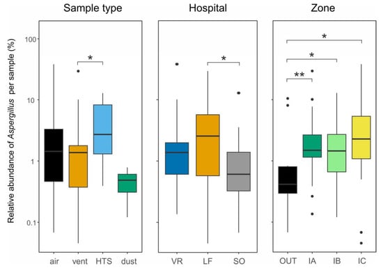 Differences in relative abundance of Aspergillus per sample, as percentages of rarefied reads, between sample types (left), hospitals (middle), and hospital zones (right). Asterisks indicate significant differences according to Mann-Whitney-Wilcoxon test (*: p ≤ 0.05; **: p ≤ 0.01). Lower and upper box boundaries are the 25th and 75th percentiles, respectively; line inside the box is the median; lower and upper lines are whiskers to minimum and maximum values, respectively; and dots are outliers. HTS: high-touch surface; hospitals: VR (Virgen del Rocío), LF (La Fe), and SO (Severo Ochoa); and zones: OUT (outside), IA (unprotected admission halls and waiting rooms), IB (clean regular patient rooms), and IC (intensive care units).