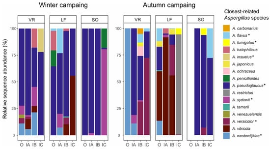 Distribution and relative abundances (percentage of reads) of Aspergillus species identified in the different sampling campaigns (winter-left vs. autumn-right), hospitals, and study zones. Sequence data from the different sample types (air, vent, HTS, and dust) were analysed together. Species identifications were assigned based on the closest related sequences from BLASTn searches at NCBI and double-checked using the Mycobank’s taxonomical data. Asterisks indicate species isolated by cultivation (see Table 2). Hospitals: VR (Virgen del Rocío), LF (La Fe), and SO (Severo Ochoa); and study zones: OUT (outside), IA (unprotected admission halls and waiting rooms), IB (clean regular patient rooms), and IC (intensive care units).