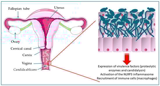 As part of the typical human microbiota, C. albicans is a common vaginal colonizer that is present in the lumen and usually causes no symptoms []. Vulvovaginal candidiasis stars when Candida spp. pierces the mucosal linings of the vagina, leading to an inflammatory response induced by its pseudohyphae and hyphae that activate the NLRP3 (NOD-like receptor protein 3) inflammasome in epithelial cells [,]. Polymorphonuclear cells and macrophages are usually the primary inflammatory cells, and the inflammatory response causes a dense discharge, irritation, itching, burning, excoriations, dysuria, dyspareunia, and even swelling [] (Figure 2). Although it is known that C. albicans causes neutrophil infiltration, the underlying mechanism remains undetermined. A recent study found that levels of proinflammatory cytokines (IL-1β and IL-8) are favorably connected with the expression of the PRA1 (pH-regulated antigen) gene, which is significantly elevated during vaginal candidiasis []. The gene is responsible for encoding a protein with various immune-modulatory properties, such as neutrophil chemotaxis and complement modulation [].