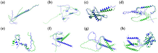 Structural alignment of proteins with no statistically significant changes in their structure. Superimposed variants are shown in green and blue. Residue identities are not labeled due to a lack of statistically relevant substitutions. Panels correspond to the following proteins: (a) Q5AB58, (b) Q5A299, (c) Q5A3K8, (d) A0A1D8PG02, (e) A0A1D8PF20 (TLO4), (f) Q5ALW9, (g) A0A1D8PLD5, and (h) A0A1D8PPD0. Green (WT—predicted structure, AlphaFold2) and blue (predicted structure with S ↔ L substitution, CoLab) indicate two protein variants aligned for comparison.