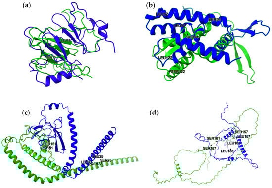 Structural alignment of proteins with statistically significant differences at the indicated residue positions. Superimposed structures highlight substitutions between serine (SER) and leucine (LEU) residues in positions (a) Q59KZ4 (SER13 ↔ LEU13), (b) Q5ACW4 (SER82 ↔ LEU82, SER94 ↔ LEU94 and SER122 ↔ LEU122), (c) Q5A7K2 (SER25 ↔ LEU25, SER33 ↔ LEU33 and SER151 ↔ LEU151), and (d) A0A1D8PNC2 (SER157 ↔ LEU157, SER181 ↔ LEU181 and SER185 ↔ LEU185). Green (WT—predicted structure, Alphafold2) and blue (predicted structure with Ser ↔ Leu substitution, CoLab) indicate two protein variants aligned for comparison. Labels indicate residue identity and position.