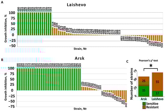 Sensitivity (green columns) and resistance (brown columns) of 132 Microdochium nivale strains to carbendazim. Panels (A,B) show the distribution of growth inhibition by carbendazim for strains isolated from the Laishevo and Arsk agrocenoses, respectively. A 100% growth inhibition indicates sensitivity of the strain to carbendazim, whereas negative values indicate that carbendazim stimulated the growth of the strain. Numbers above or below the columns show the last three digits of the strain’s accession number. Panel (C) shows the results of a χ2 test, indicating that the proportion of resistant strains within the strain pool was statistically higher (asterisk, p < 0.05) in the sample of strains from the Laishevo agrocenosis compared to that in the sample of strains from the Arsk agrocenosis.