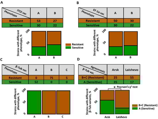 The frequency of carbendazim resistance among strains with the “A” ITS2 variant was similar to that for the strains with the “B” ITS2 variant (Pearson’s χ2-test, p < 0.05) (Figure 2A). Similarly, carbendazim-resistant and carbendazim-sensitive strains were comparably represented within the groups of strains carrying the “A” and “B” variants of EF-1α (Pearson’s χ2-test, p < 0.05) (Figure 2B). In turn, a strong relationship was observed between carbendazim resistance and the β-Tub sequence variant. All 52 strains with the “A” β-Tub variant were carbendazim-sensitive, while all strains with the “B” (75 strains) and “C” (5 strains) β-Tub variants were carbendazim-resistant (Figure 2C). Herewith, in the sample of strains isolated from the Laishevo agrocenosis, which had been previously treated with benzimidazole fungicides, the proportion of strains with the “B” and “C” β-Tub variants together (associated with carbendazim resistance) within the strain pool was statistically higher than that in the sample of strains isolated from the Arsk agrocenosis, where fungicides had not been previously applied (Figure 2D).