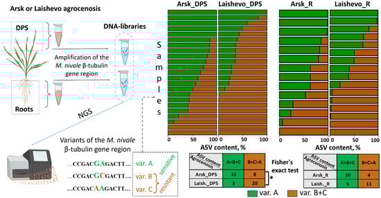 The comparison of the relative abundance of different Microdochium nivale β-tubulin gene sequence variants (corresponding to carbendazim sensitivity or carbendazim resistance of the strain) in environmental plant samples (roots (R) or dead parts of shoots (DPS)) collected from two agrocenoses: one previously treated with benzimidazole fungicides (Laishevo) and one untreated (Arsk). The charts show the relative abundance of amplicon sequence variants (ASVs) corresponding to β-tubulin gene variants associated with carbendazim sensitivity (variant A, green) and carbendazim resistance (variants B and C together, brown) in each analyzed sample. The numbers in the contingency tables show the number of samples with a predominance of either carbendazim sensitivity-related ASVs (green) or carbendazim resistance-related ASVs (brown). The significance of the difference (asterisk, p < 0.05) in the relative abundance of carbendazim sensitivity-related ASVs and carbendazim resistance-related ASVs in different agrocenoses was analyzed using Fisher’s exact test. NGS—next-generation sequencing.