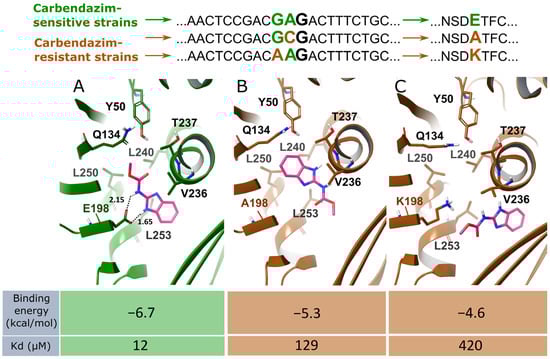 Modeling of carbendazim interactions with different variants of Microdochium nivale β-tubulin differing in the amino acid residues at position 198. Variant A (E198) of β-tubulin is typical of carbendazim-sensitive strains, whereas variants B (A198) and C (K198) are typical of carbendazim-resistant strains. E198 facilitates the formation of hydrogen bonds with carbendazim (A), which are absent in variants A198 (B) and K198 (C). K198 leads to electrostatic repulsion between carbendazim and the carbendazim-binding pocket of β-tubulin (C).