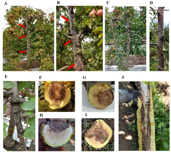 Symptoms of Botryosphaeria canker and dieback in commercial orchards of apple associated with Botryosphaeriaceae species isolated in central Chile. (A) Apple tree of 25-year-old cv. Cripps Pink with elongated canker in the trunk (red arrow) and dieback (white arrow). (B) Severe perennial cankers in the trunk of a 25-year-old apple tree cv. Cripps Pink. (C) Mature canker in the trunk and branches with dieback (15-year-old tree cv. Cripps Pink). (D) Young tree (7-year-old) cv. Fuji showing orange canker and dieback with presence of pycnidia and of central axis. (E) perennial canker in secondary branch of apple tree cv. Fuji. (F–H) Cross-section of branches with dieback showing brown hard cankers (U- and V-shaped). (I) Cross-section of trunk of mature tree of a 25-year-old cv. Gala showing brown hard V-shaped canker. (J) Longitudinal section of dieback branch of 12-year-old cv. Fuji showing elongated brown hard necrosis in the wood. Diplodia mutila (F), Diplodia seriata (G), Lasiodiplodia theobromae (H), and Neofusicoccum arbuti (I) show similar symptoms that are characteristic of Botryosphaeria dieback, generating wedge-shaped dark brown to blackish wood necrosis [].