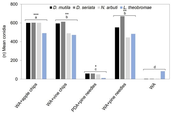 Average conidia production in Diplodia mutila, Diplodia seriata, Neofusicoccum arbuti, and Lasiodiplodia. theobromae under different substrates and growth conditions. Bars show culture media based on water agar (WA) with the addition of apple chips, grape chips, pine needles y PDA medium with pine needles, and water agar (WA) without supplements. Development temperature was 24 °C and 15 days of exposure to ultraviolet light (λ = 350 nm) under a dark chamber. (*) Shows the relative level of conidia production, where * represents low, ** intermediate and *** high production. Values with the same letters are not significantly different according to the Tukey test (p value < 0.0001) when comparing different culture substrates.