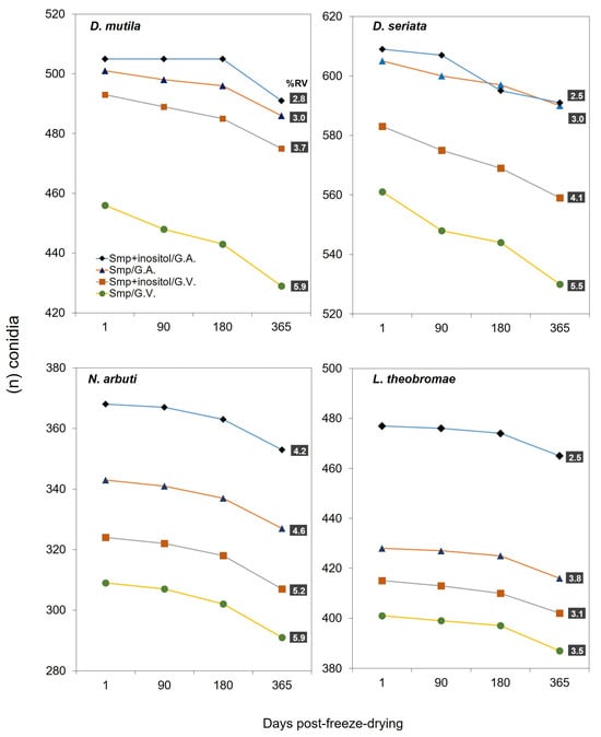 Viability and survival of Diplodia mutila, Diplodia seriata, Neofusicoccum arbuti, and Lasiodiplodia theobromae after freeze-drying. The number of colony-forming units (CFU) counted at a 10−4 post-freeze-drying dilution is shown. Type of container used for the freeze-drying process: G.V. = glass vials and G.A. = glass ampoules. Protective medium used for the freeze-drying process: (SMP) 20% skimmed milk powder. (SMP + inositol) 20% evaporated skimmed milk plus the addition of 5% inositol. (RV) represents the percentage reduction in viability after the freeze-drying process, over time (after 365 days of storage).