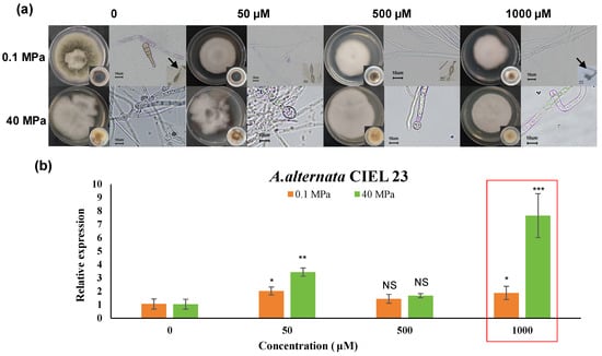 Phenotypes and the PKS gene expression of A.alternata CIEL 23. (a) the colony phenotypes of A. alternata CIEL 23, which was cultured with four concentrations of 5-AzaC (0, 50 μM, 500 μM, and 1000 μM) on PDA at 28 °C under the different culture pressures. The mycelia and spore phenotypes were taken under a ×40 microscope with a scale of 10 μm. The arrow points to the spore elongated beaks. (b) the PKS gene expression of A.alternata CIEL 23 cultured at different concentrations of epigenetic modifiers under different culture pressures. The X-axis was the different concentrations of 5-AzaC, and the Y-axis was the relative expression. Compared with black controls, results were considered to be significant at the level of p (NS p > 0.05, * p < 0.05, ** p < 0.01, *** p < 0.001).