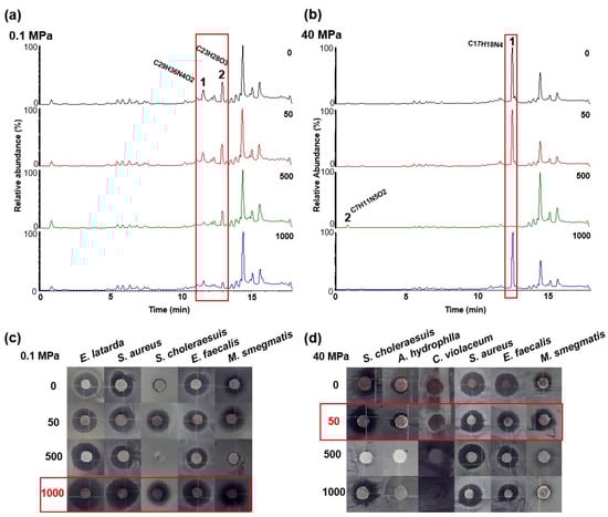 Secondary metabolites of A. alternata CIEL 23 at different concentrations of 5-AzaC under different conditions. (a) the UPLC-MS/MS spectra of secondary metabolites of A. alternata CIEL 23 under atmospheric pressure condition. (b) the UPLC-MS/MS spectra of the secondary metabolites of A. alternata CIEL 23 under HHP condition. The X-axis was the retention time (min), and the Y-axis was the Relative response (%). The total ion chromatogram (TIC) of the products produced by the strain in media containing different concentrations of 5-AzaC (the number in the upper right corner of the picture indicates the concentration of 5-AzaC) was indicated by different colored lines (black-0, red-50 μM, green-500 μM, and blue-1000 μM). The different signal peaks were marked in the red box. (c) the antibacterial activities of secondary metabolite of A. alternata CIEL 23 under atmospheric pressure condition. (d) the antibacterial activities of secondary metabolite of A. alternata CIEL 23 under HHP condition. The number on the left of the picture indicates the concentration of 5-AzaC. The additive concentration group inducing maximal response was boxed in red.