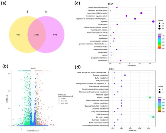 Graph of differentially expressed genes analyzed in group B\A. (a) the Venn diagram of gene co-expression. The graphs showed the number of genes uniquely expressed in each group, and the overlapping areas showed the number of genes co-expressed in two groups. (b) the volcano map of differential genes. The X-axis was the log2Fold Change value, and the Y-axis was the −log10 padj or −log10 p-value. The blue dashed line indicated the threshold line for the differential gene screening criteria. (c) the scatter plot of GO pathway enrichment. (d) the scatter plot of KEGG pathway enrichment. In (c,d), the X-axis was the Gene Ratio, and the Y-axis was the name of the pathway. The size of the padj was indicated by the color of the dots. The smaller the padj was, the closer the color was to red. The number of differential genes contained under each pathway was indicated by the size of the dots.