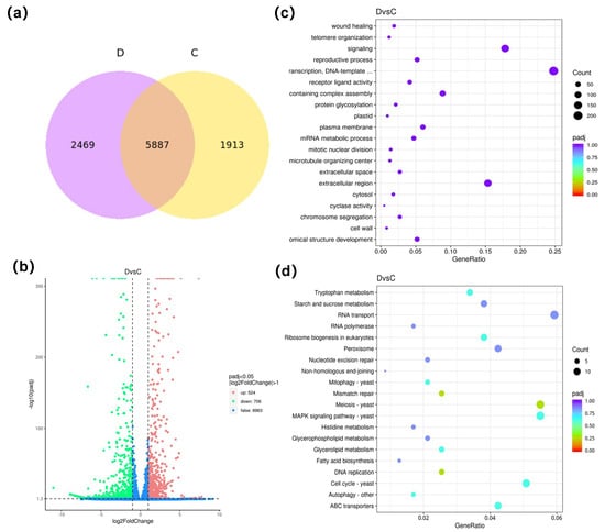 Graph of differentially expressed genes analyzed in group D\C. (a) the Venn diagram of gene co-expression. The graphs showed the number of genes uniquely expressed in each group, and the overlapping areas showed the number of genes co-expressed in two groups. (b) the volcano map of differential genes. The X-axis was the log2Fold Change value, and the Y-axis was the −log10 padj or −log10 p-value. The blue dashed line indicated the threshold line for the differential gene screening criteria. (c) the scatter plot of GO pathway enrichment. (d) the scatter plot of KEGG pathway enrichment. In (c,d), the X-axis was the Gene Ratio, and the Y-axis was the name of the pathway. The size of the padj was indicated by the color of the dots. The smaller the padj was, the closer the color was to red. The number of differential genes contained under each pathway was indicated by the size of the dots.