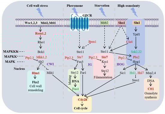 - Nishimura, A.; Yamamoto, K.; Oyama, M.; Kozuka-Hata, H.; Saito, H.; Tatebayashi, K. Scaffold protein Ahk1, which associates with Hkr1, Sho1, Ste11, and Pbs2, inhibits cross talk signaling from the Hkr1 osmosensor to the Kss1 mitogen-activated protein kinase. Mol. Cell Biol. 2016, 36, 1109–1123. [Google Scholar] [CrossRef] [PubMed]