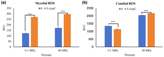 Reactive oxidative stress (ROS) can act as signaling molecules to activate stress response pathways, aiding hyphal adaptation to adverse environments [35]. In this study, the ROS levels of mycelia and spores were quantitatively determined using the Reactive Oxygen Species Assay Kit (Beyotime, Shanghai, China) (Figure 6). Under dual-stress conditions with 5-AzaC, hyphal ROS levels increased twofold, whereas spore ROS remained unchanged. This suggested that hyphae were more sensitive to environmental changes than spores.