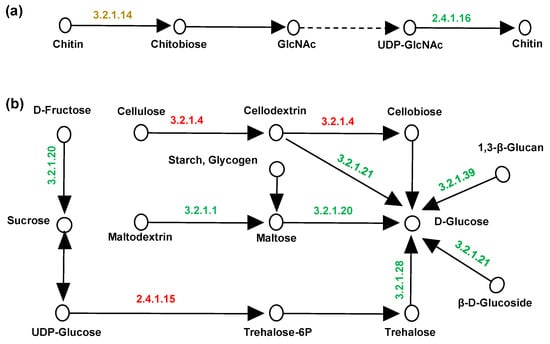 Diagram of the pathway of chitin metabolism and starch and sugar metabolism. (a) the chitin metabolism in D\C group. (b) the starch and sugar metabolism in D\C group. The upregulation was marked in red, the downregulation was marked in green, and both were marked in yellow. The arrow indicates the direction of synthesis.