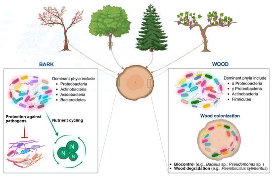 Bacterial diversity in plant bark and inner wood. Created in BioRender. Mesguida, O. (2025) https://BioRender.com/g0s8ixq (accessed on 3 July 2025).
