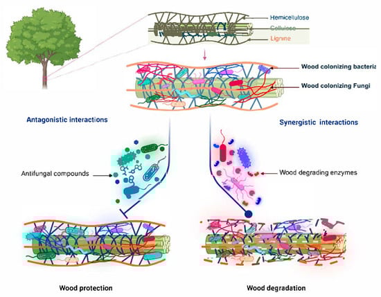 Functional interactions between the bacteria and fungi colonising plant wood. Created in BioRender. Mesguida, O. (2025) https://BioRender.com/ijxfm3l (accessed on 3 July 2025).