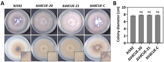 Mycelial plugs of identical diameter were excised from the wild-type strain XJ592, gene deletion mutants ΔVdCUE-20 and ΔVdCUE-21, and the complemented strain ΔVdCUE-C. Each plug was individually inoculated onto the center of PDA plates and incubated in the dark at 25 °C for 2 weeks. Analysis of colony morphology showed that, unlike the XJ592 and ΔVdCUE-C strains, the ΔVdCUE-20 and ΔVdCUE-21 strains produced white mycelia with significantly reduced melanized microsclerotia (Figure 1A). No significant differences in colony diameter were observed among these strains (Figure 1B). These findings demonstrate that VdCUE is involved in microsclerotia development but is not required for the vegetative growth of V. dahliae.