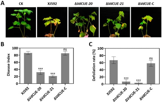 To investigate the role of VdCUE in the virulence of V. dahliae XJ592 and the leaf defoliation of inoculated cotton, conidia of XJ592, ΔVdCUE-20, ΔVdCUE-21, and ΔVdCUE-C were inoculated into two-leaf-stage susceptible cotton cultivar ‘Jimian 11’ via root-dip inoculation. Disease symptoms were assessed in cotton seedlings at 4 wpi. Cotton plants inoculated with XJ592 and ΔVdCUE-C showed typical Verticillium wilt symptoms, including leaf yellowing and wilting; in severely diseased plants, a significant proportion of leaves underwent defoliation. By contrast, cotton plants inoculated with ΔVdCUE-20 and ΔVdCUE-21 exhibited milder disease symptoms (Figure 2A and Figure S1A). Consistently, ΔVdCUE-20 and ΔVdCUE-21 caused significantly reduced disease index and defoliation rates on cotton plants compared with XJ592 and the complemented strain (Figure 2B,C and Figure S1B,C). These results indicate that VdCUE is critical for the virulence of XJ592.