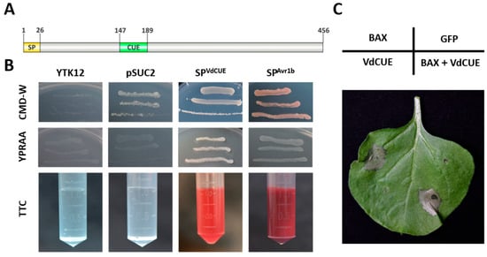 In this assay, the pSUC2 vector containing the Avr1b SP (SPAvr1b) sequence was used as the positive control, while YTK12 transformed with the empty pSUC2 vector served as the negative control. As expected, only the transformants carrying SPVdCUE and the positive control strains exhibited normal growth on YPRAA medium (Figure 3B).